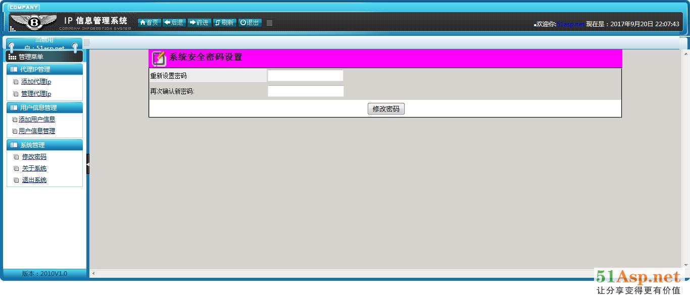 分管理员和普通用户两种权限,普通用户登录只能查询相关ip信息,管理员账号密码:51asp.net 普通用户账号密码:aa